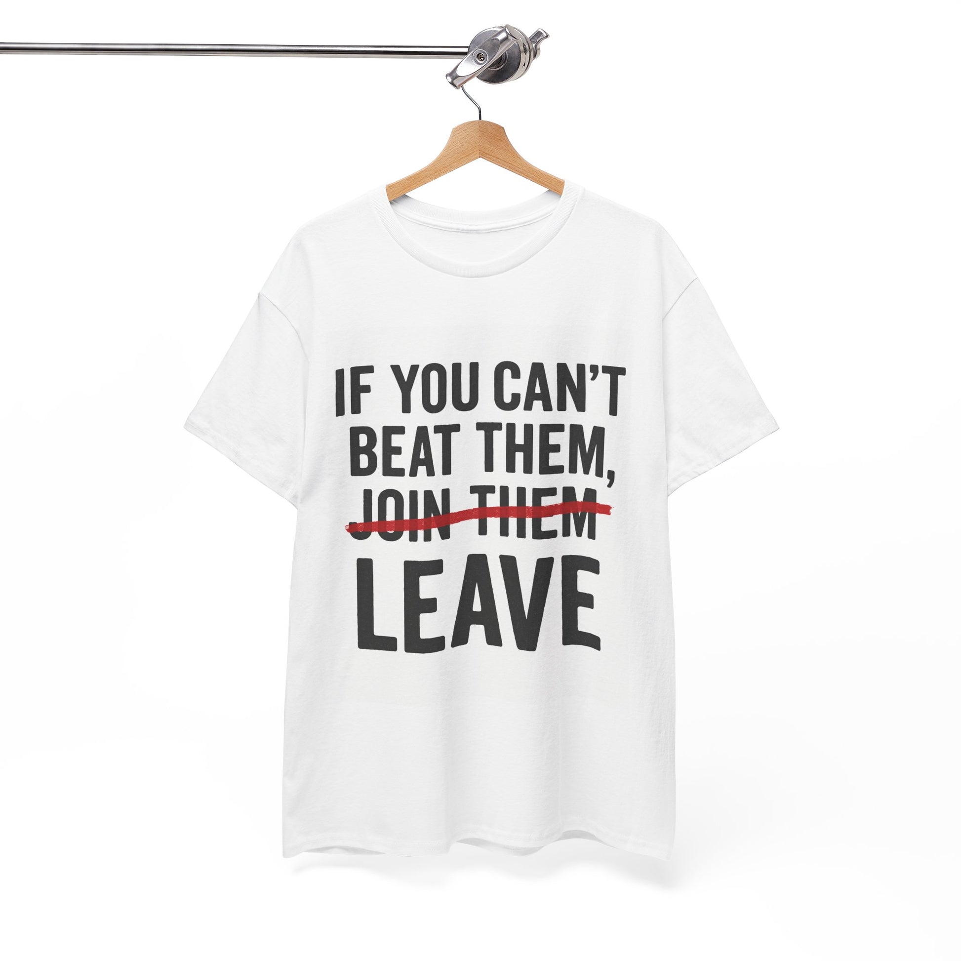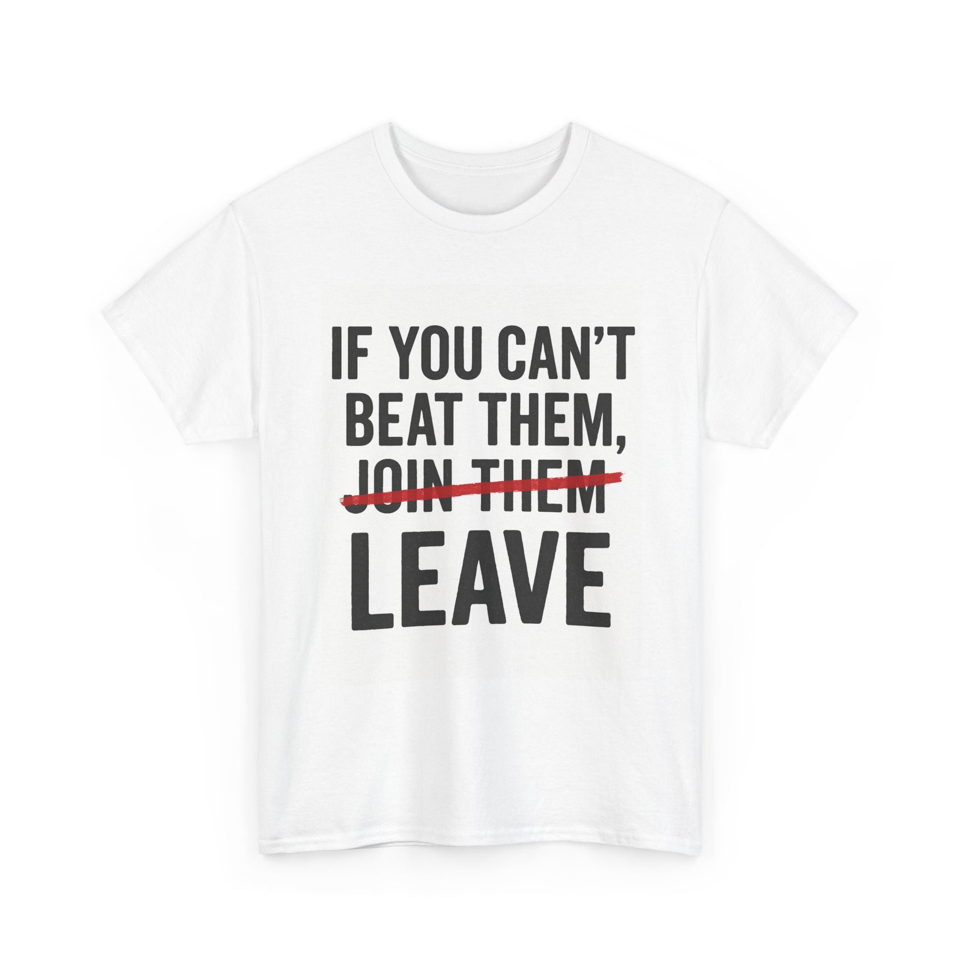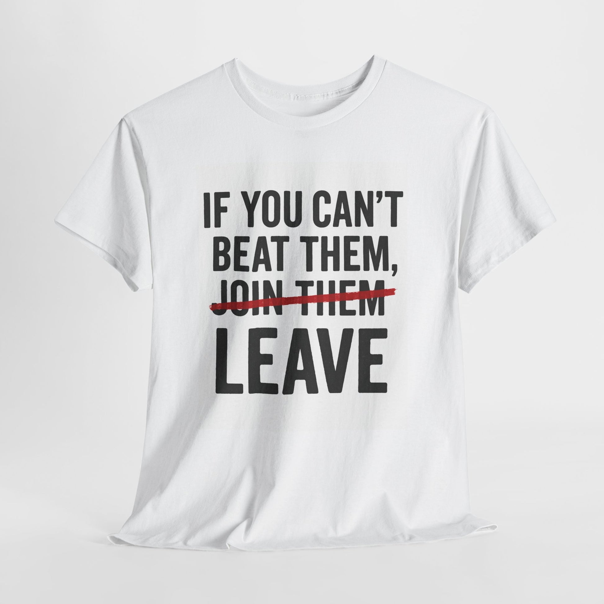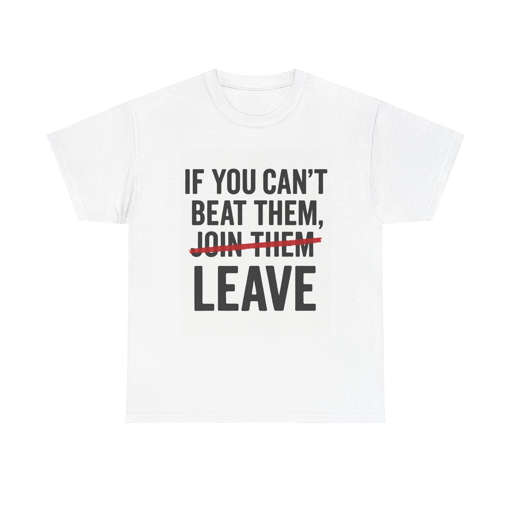 Designed with a powerful twist on the classic saying, the word “JOIN THEM” is boldly crossed out in striking red, replaced by LEAVE — sending a strong message about independence, courage, and walking your own path.